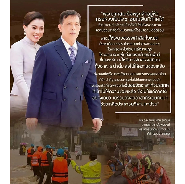 总理表示,国王陛下从私人资金中拨出1亿泰铢,捐赠予合艾医院用于购置医疗设备以替换受损器械,并向军方及国家警察总署捐赠用于搜救和运送物资的无人机,以援助受灾民众。臣拜谢圣恩。