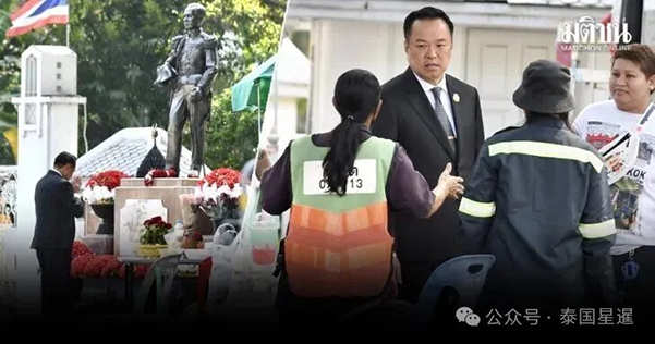 随后,总理上前与曼谷市律实区的环卫工人问候交谈并合影。返回后,他向媒体表示,自己履职数月任期将尽,期间多次有人建议应参拜此处的春蓬亲王纪念碑,今日恰有时间,故特地前来瞻仰。